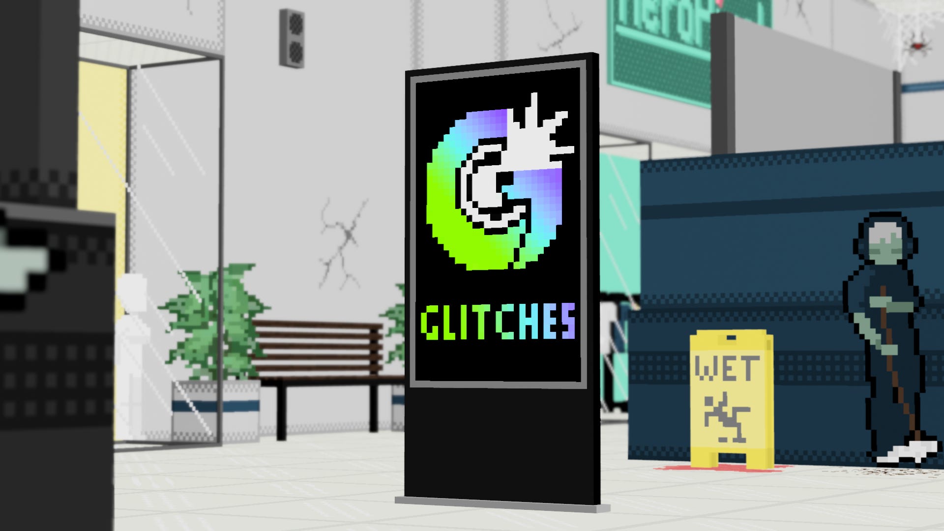 Zom-BIT, however, was a slightly different workflow since Kelseu was providing most of the 2D elements and sending them to doodle to be compiled later. When thinking of the world-making process, she mentions that "the first build-and-test we did was a big moment of excitement for me, being able to see all of my pixel art assembled together in-game motivated me to work harder." Behind the posters you can see dancing skeletons atop an indoor fountain, zombies roaming the nostalgic shopping center, and punny store names like 'Hot Stop It' and 'Rears'. Kelseu provided these 2D elements which were then placed, directed and rigged to roam by doodledrop. They also graciously involved Glitches.VR by asking Zilthus and I to make pixel posters of our own, with small blurbs to feature in the mall.